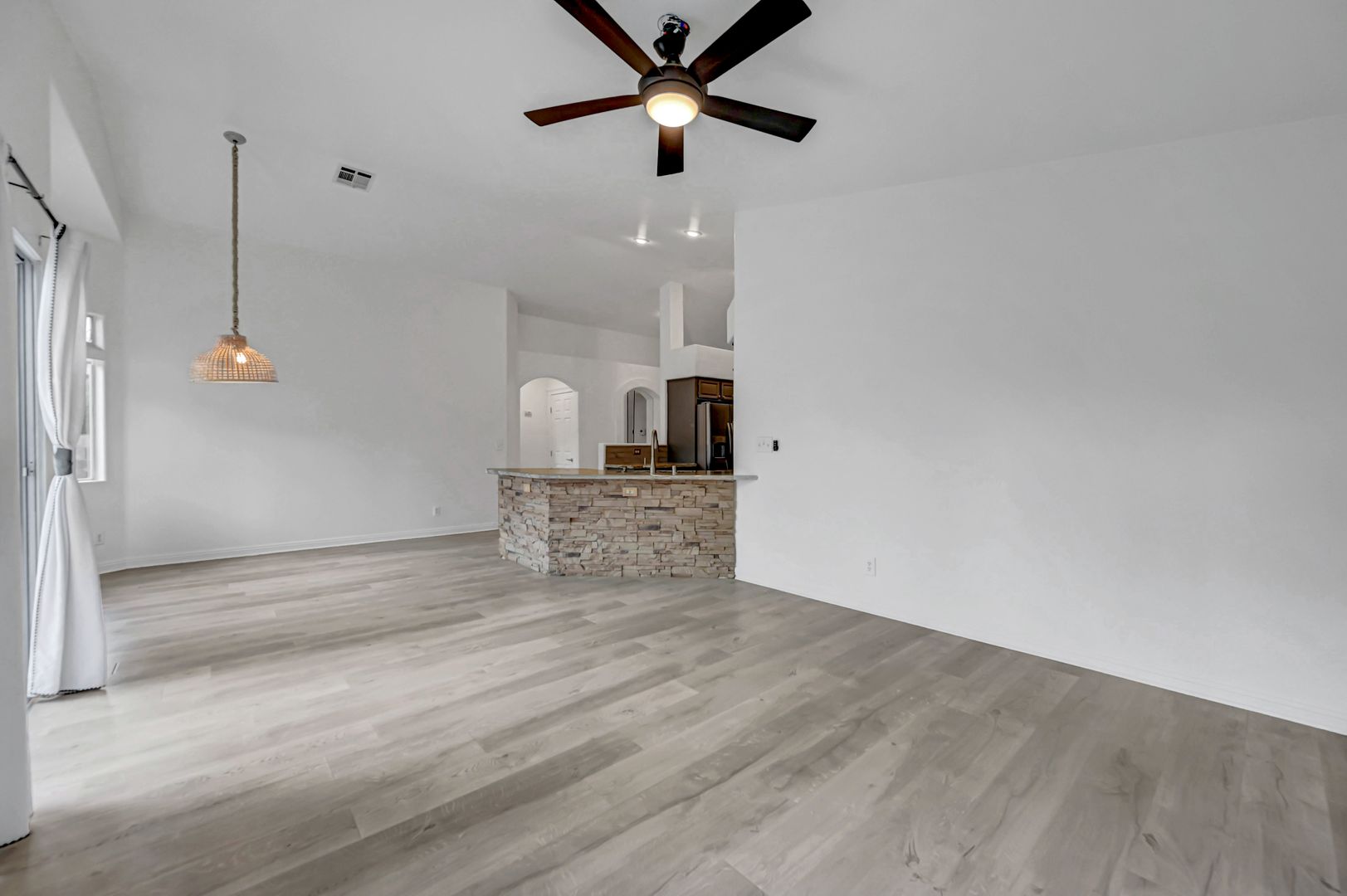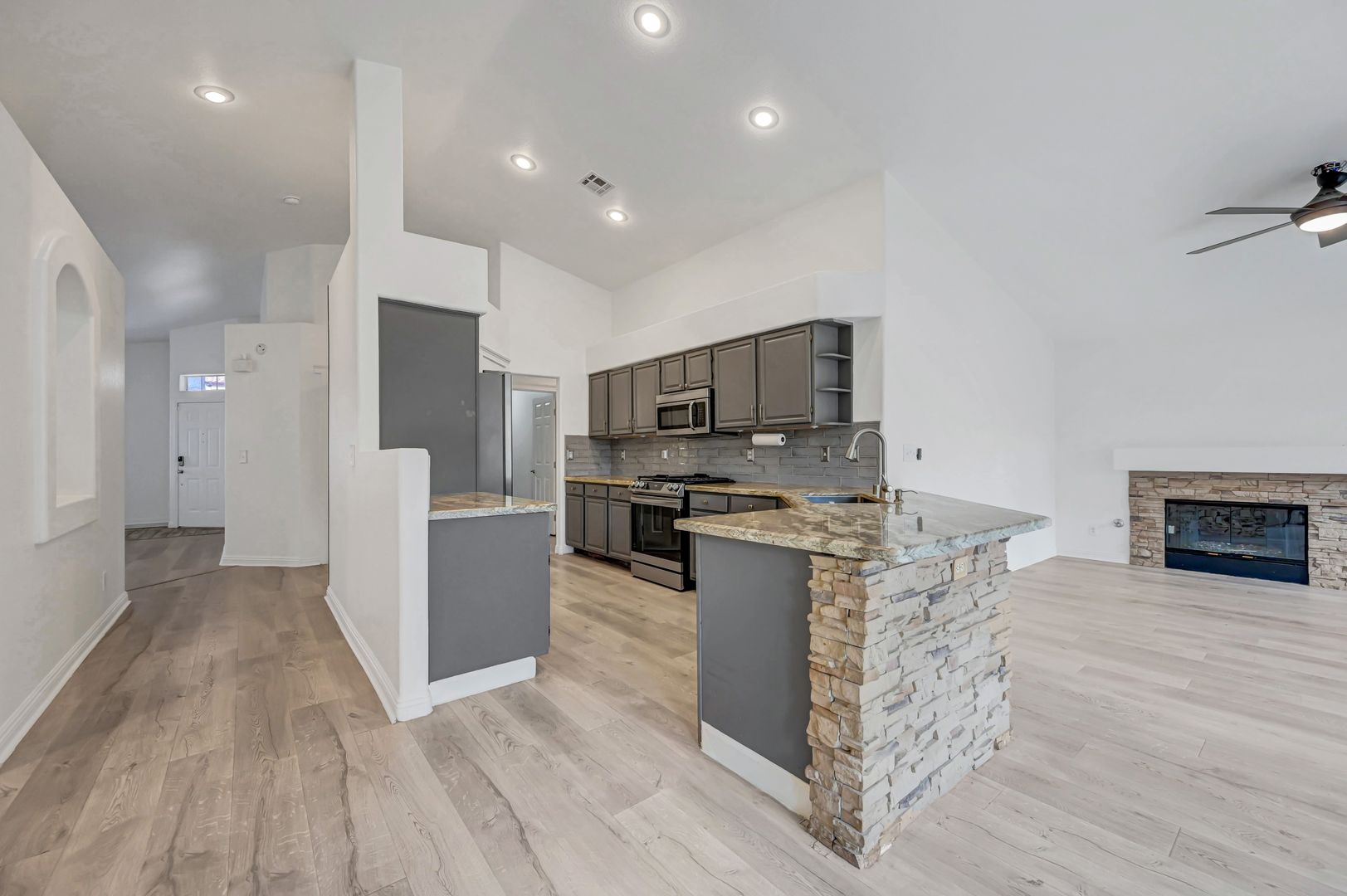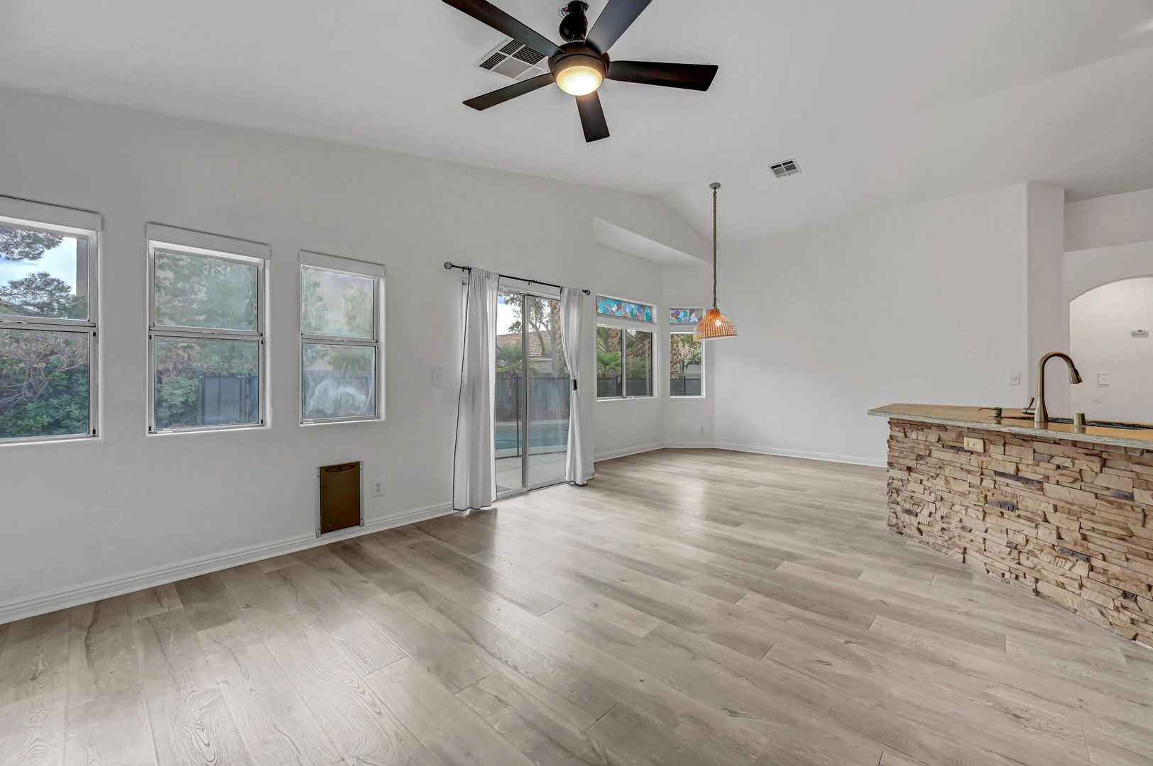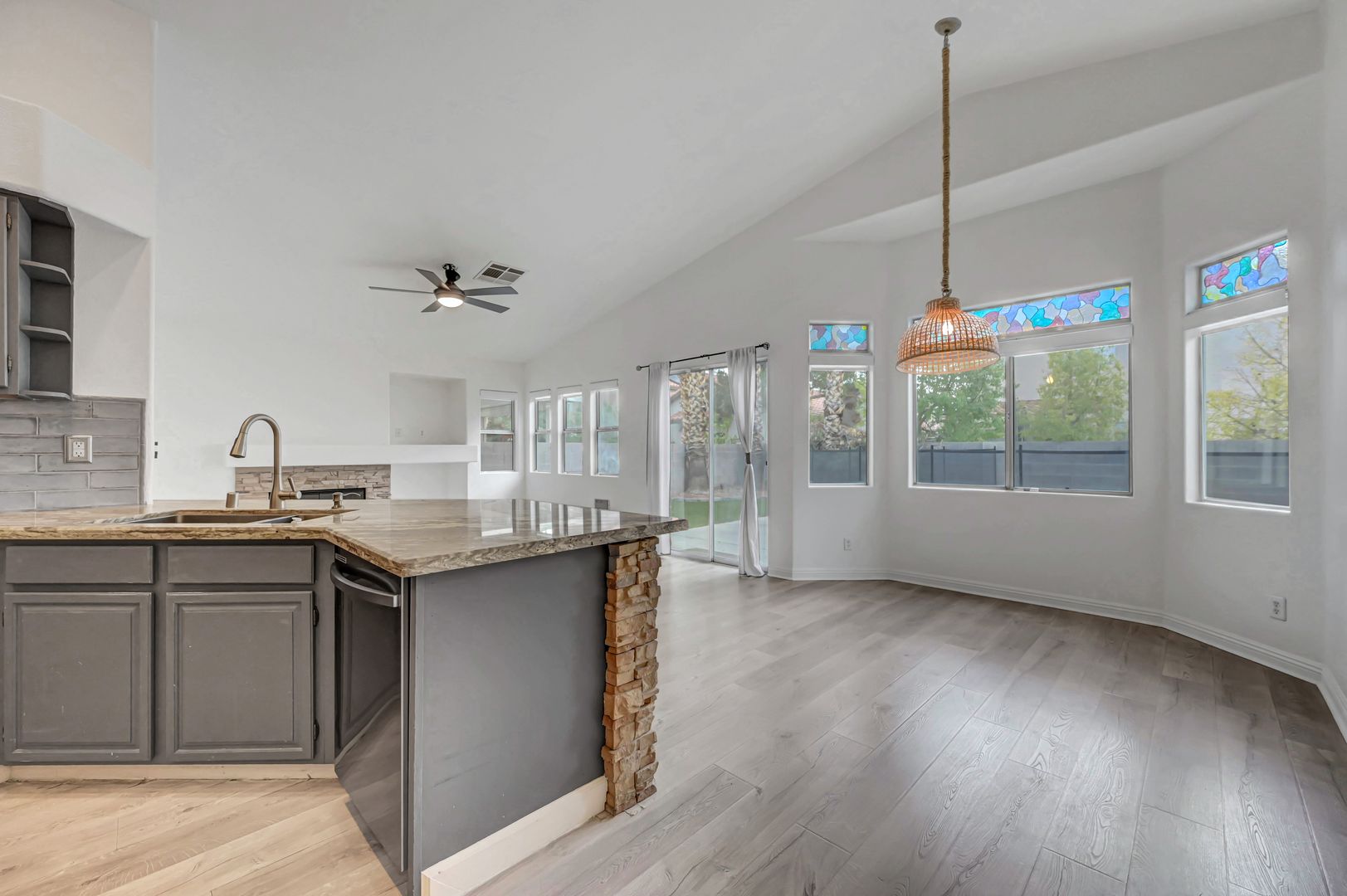 Come see this beautiful three bedroom two bath pool home today. This home features luxury vinyl plank flooring, an upgraded kitchen with granite countertops, stone featured island and custom cabinets. The backyard offers a fully fenced pool and turf. The primary bathroom has been upgraded with luxury vinyl plank flooring, custom tile shower and custom vanity. The primary closet boasts built in features. The living room offers a fireplace for a cozy evening in. Ceiling fans located throughout the home.