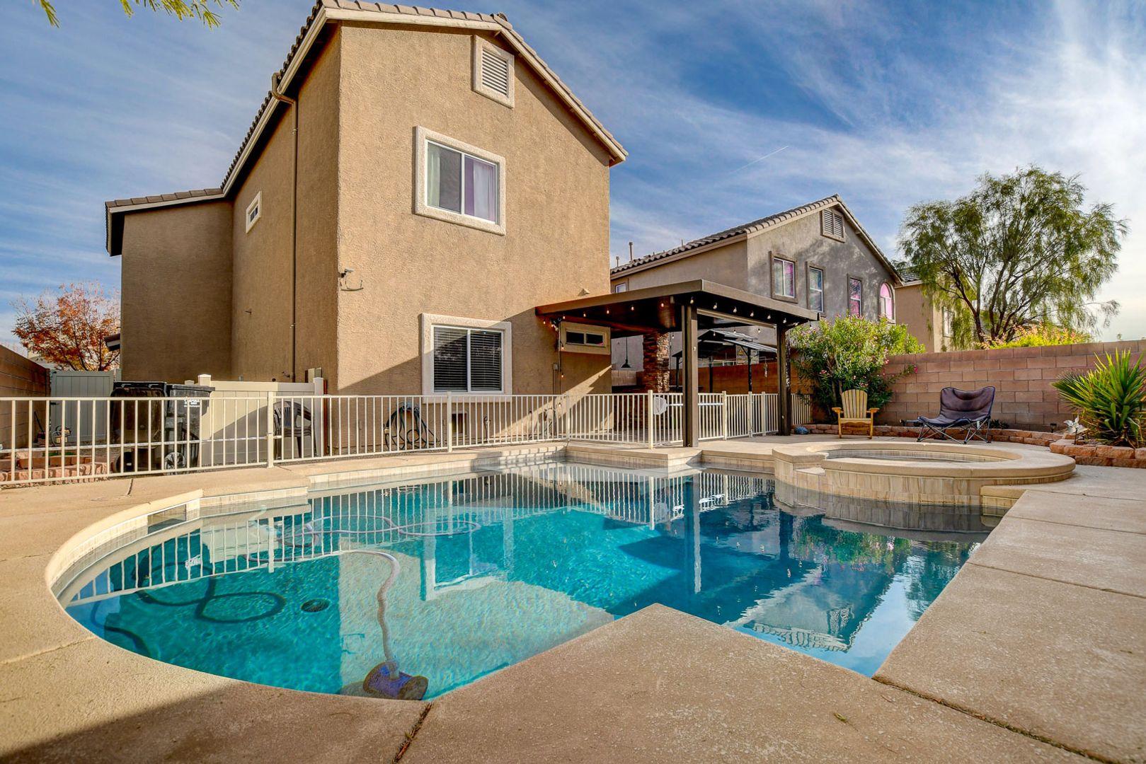 Absolutely wonderful home, great for entertaining! Sparkling pool & spa with a fantastic outdoor bar area for your BBQ! The pool/spa is solar-heated and fully fenced! Primary bedroom is downstairs and has a custom walk-in closet! Crown moldings, and custom woodwork in the family room! Fabulous kitchen with a bay window letting in lots of light, gorgeous cabinets, Corian counters, and pantry! Upstairs you’ll find three oversized bedrooms, each with walk-in closets, a full-size laundry room, and spacious loft! Lots of great shopping and restaurants close by! Easy access to the 215 beltway! Pool and spa service is $150/ month. This pool home will go fast! Must See Today!